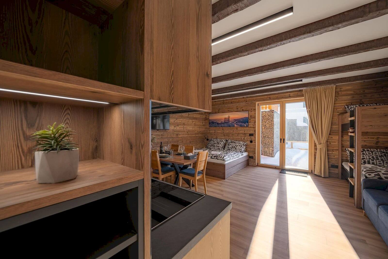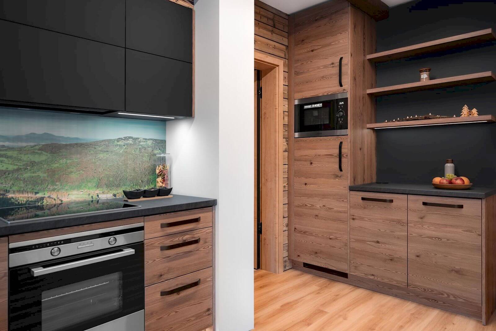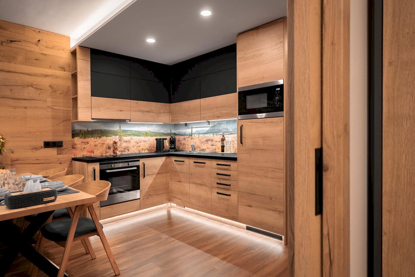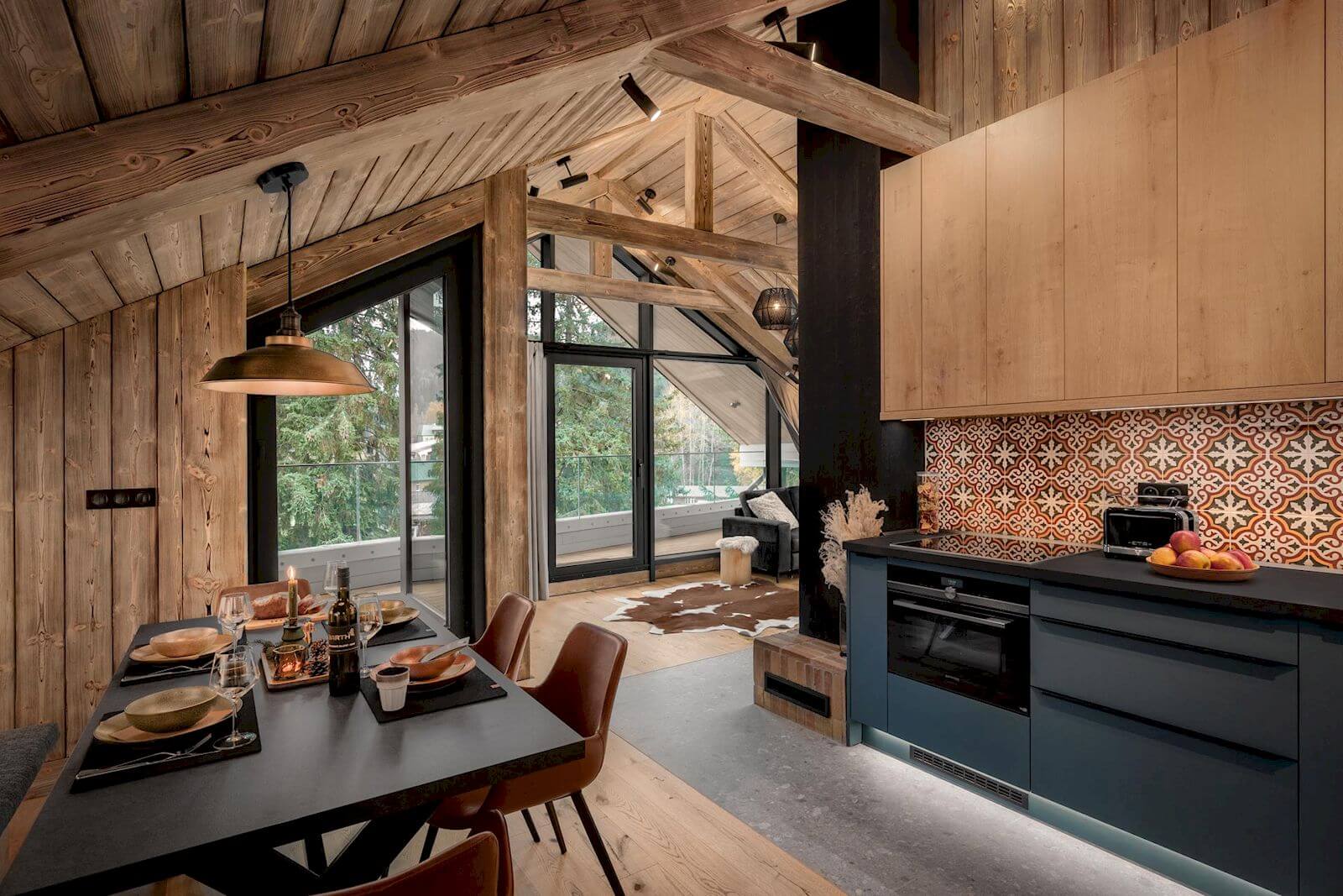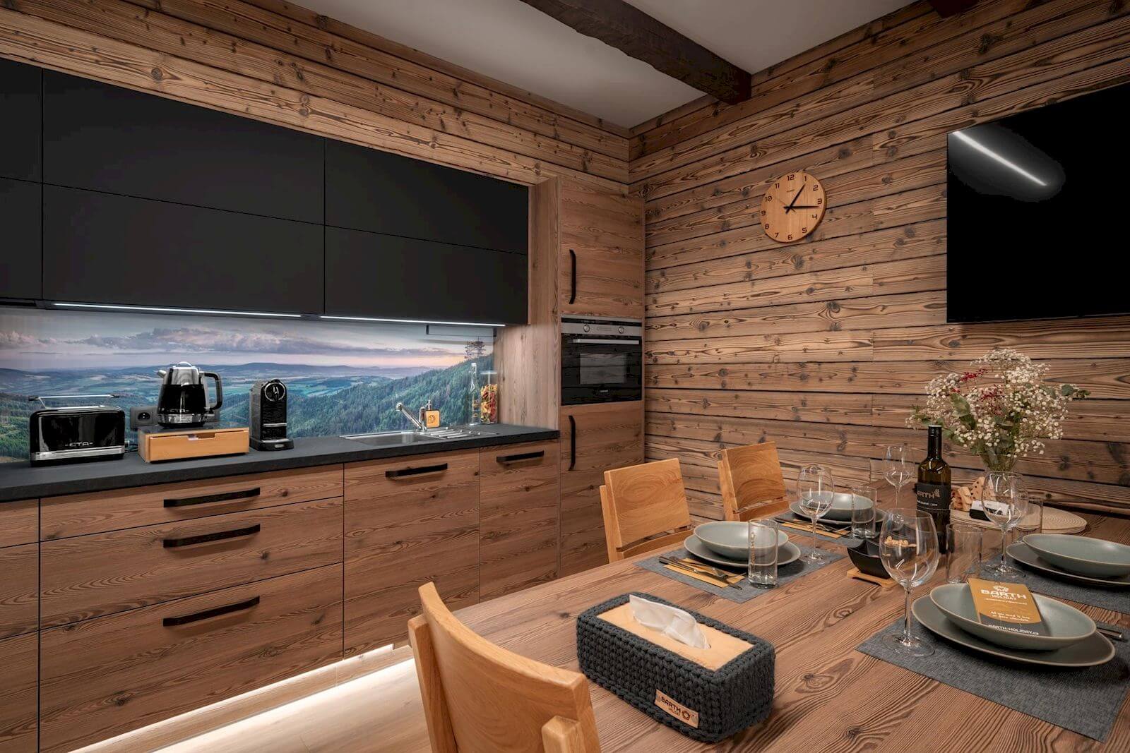 Ve všech projektech jsme využili kombinaci dřevěných palubek a masivních obkladů na míru, které vytvořily příjemnou horskou atmosféru. Kuchyně jsme vybavili moderními spotřebiči a praktickým úložným prostorem, aby hostům poskytly maximální komfort.