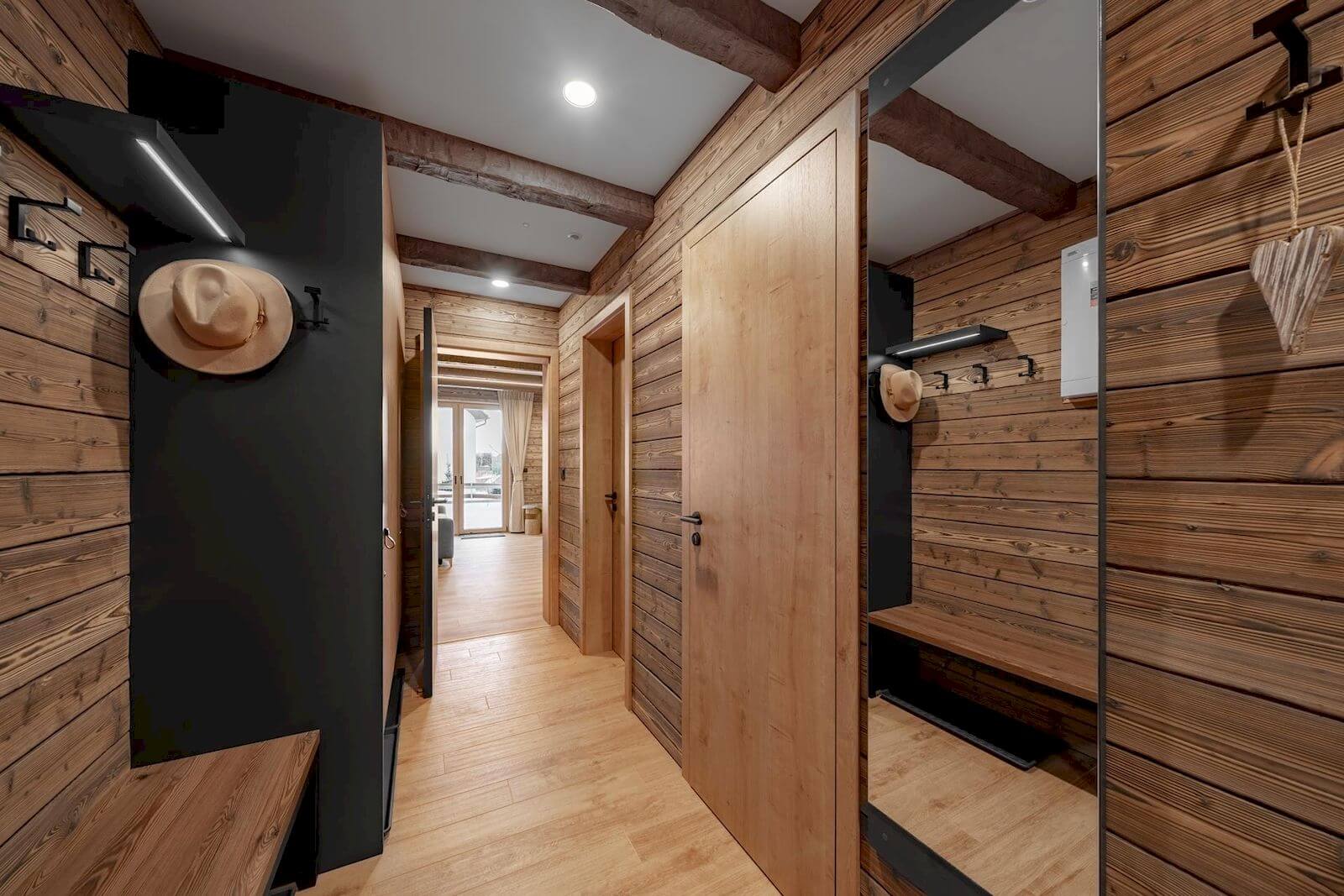 Každá lokalita dostala vlastní charakter – od grafoskla s fotografiemi po falešné trámy se skrytým LED osvětlením. V Dolní Moravě jsme navíc realizovali obložení wellness části, aby celý komplex působil jednotně. Díky vlastní truhlářské výrobě jsme mohli každý detail přizpůsobit prostoru a potřebám investora, a to s důrazem na kvalitu, estetiku a dlouhou životnost.