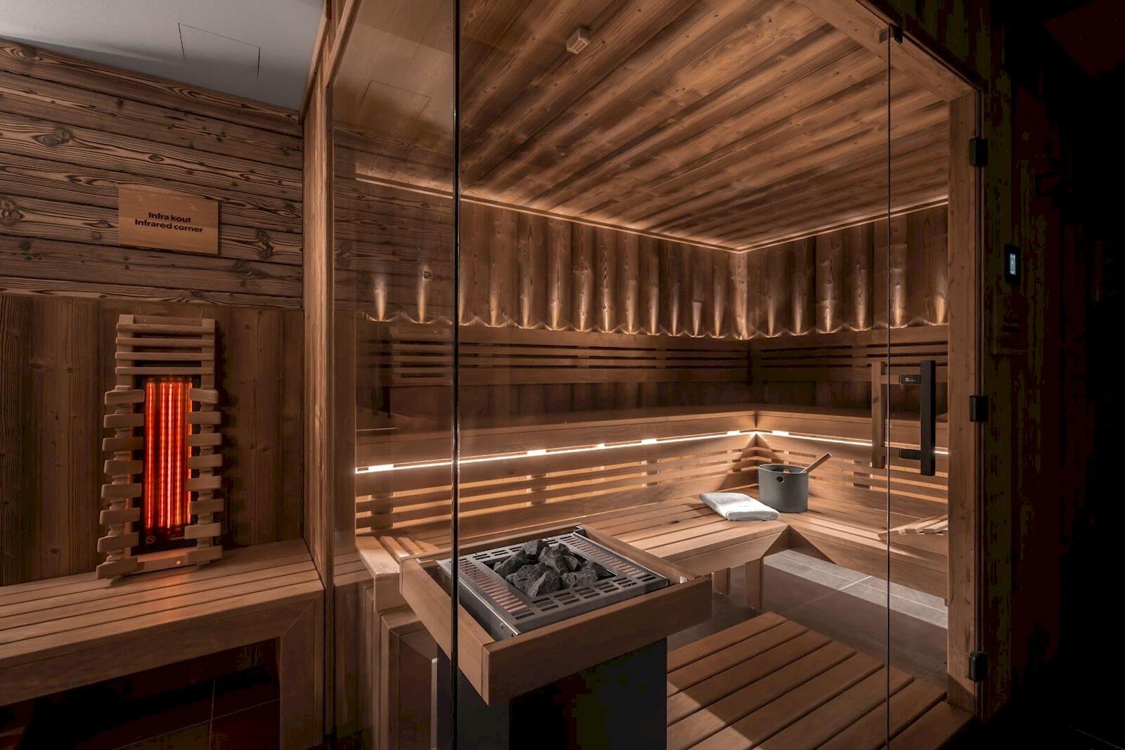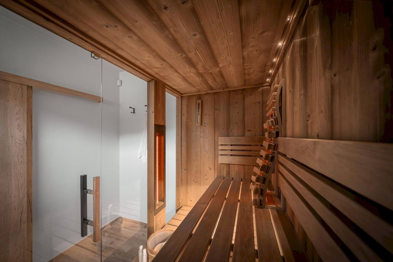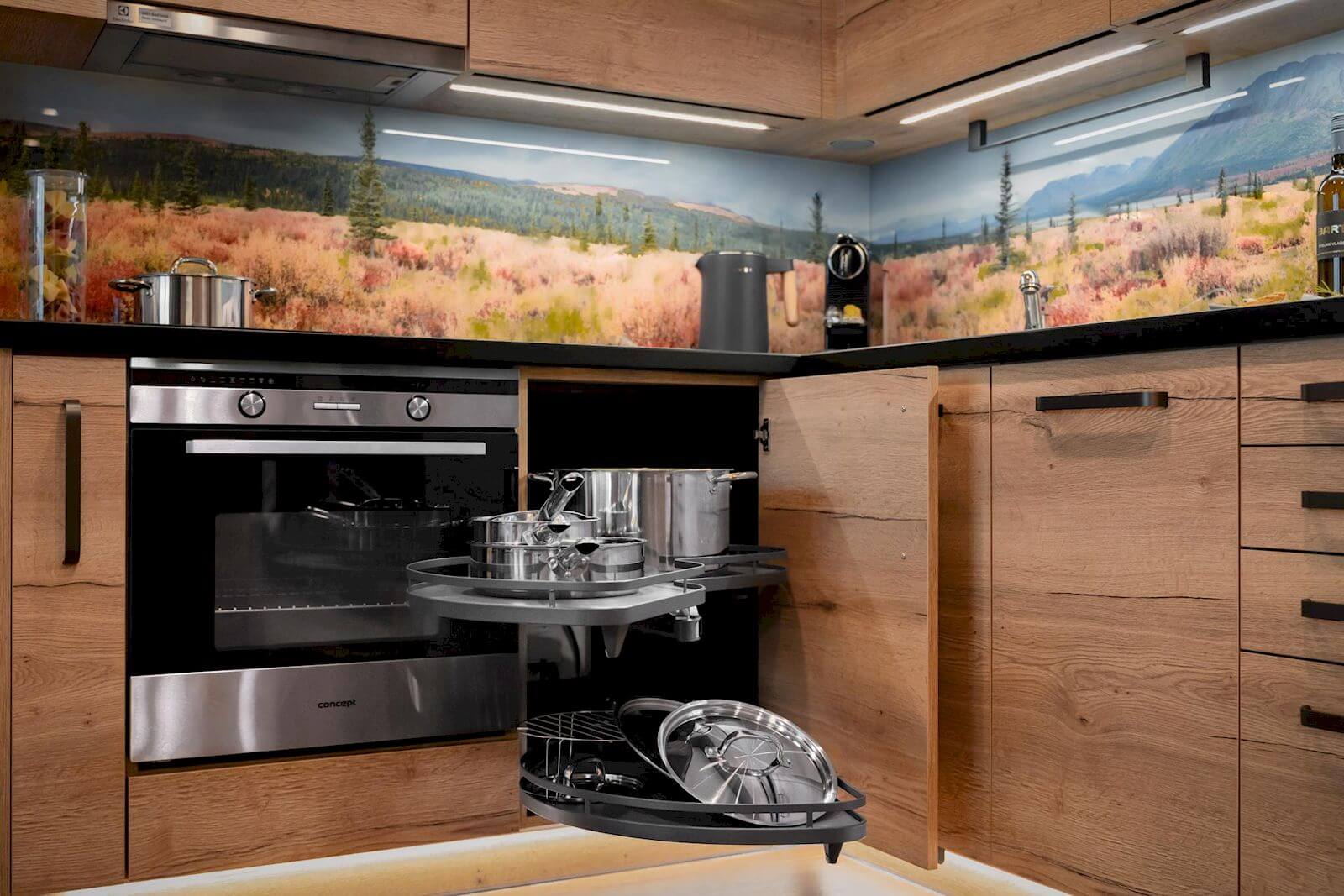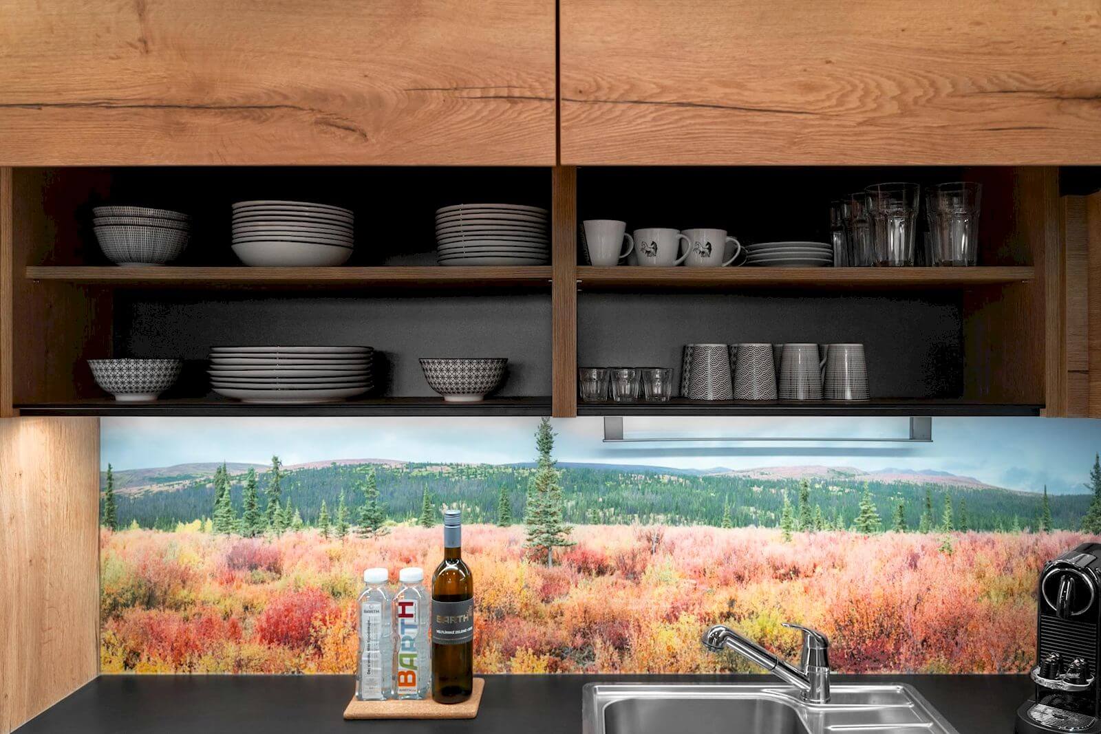 Každá kuchyně je doplněna grafosklem s originálními fotografiemi Dolní Moravy, které interiéru dodává jedinečný charakter. Součástí projektu bylo i dřevěné obložení pro wellness část, díky kterému se celý komplex nese v jednotném designovém stylu.