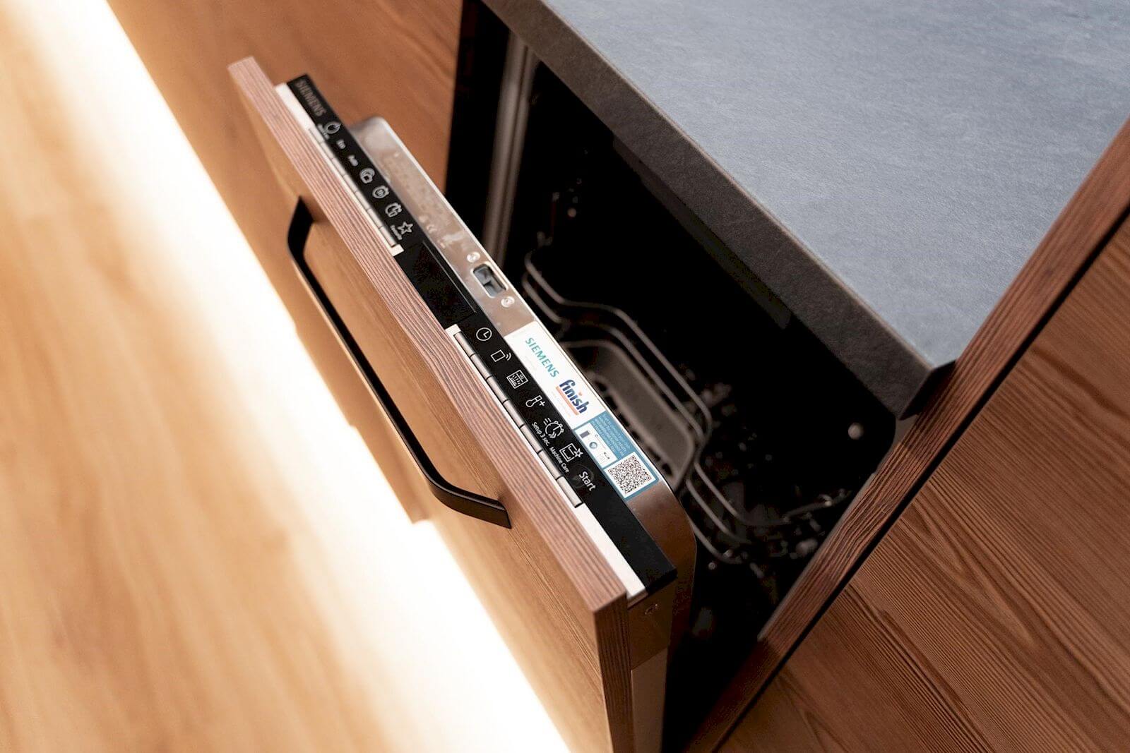 Kuchyně jsou plně vybavené spotřebiči a sladěné s obývacími částmi, aby celek působil harmonicky a prakticky.