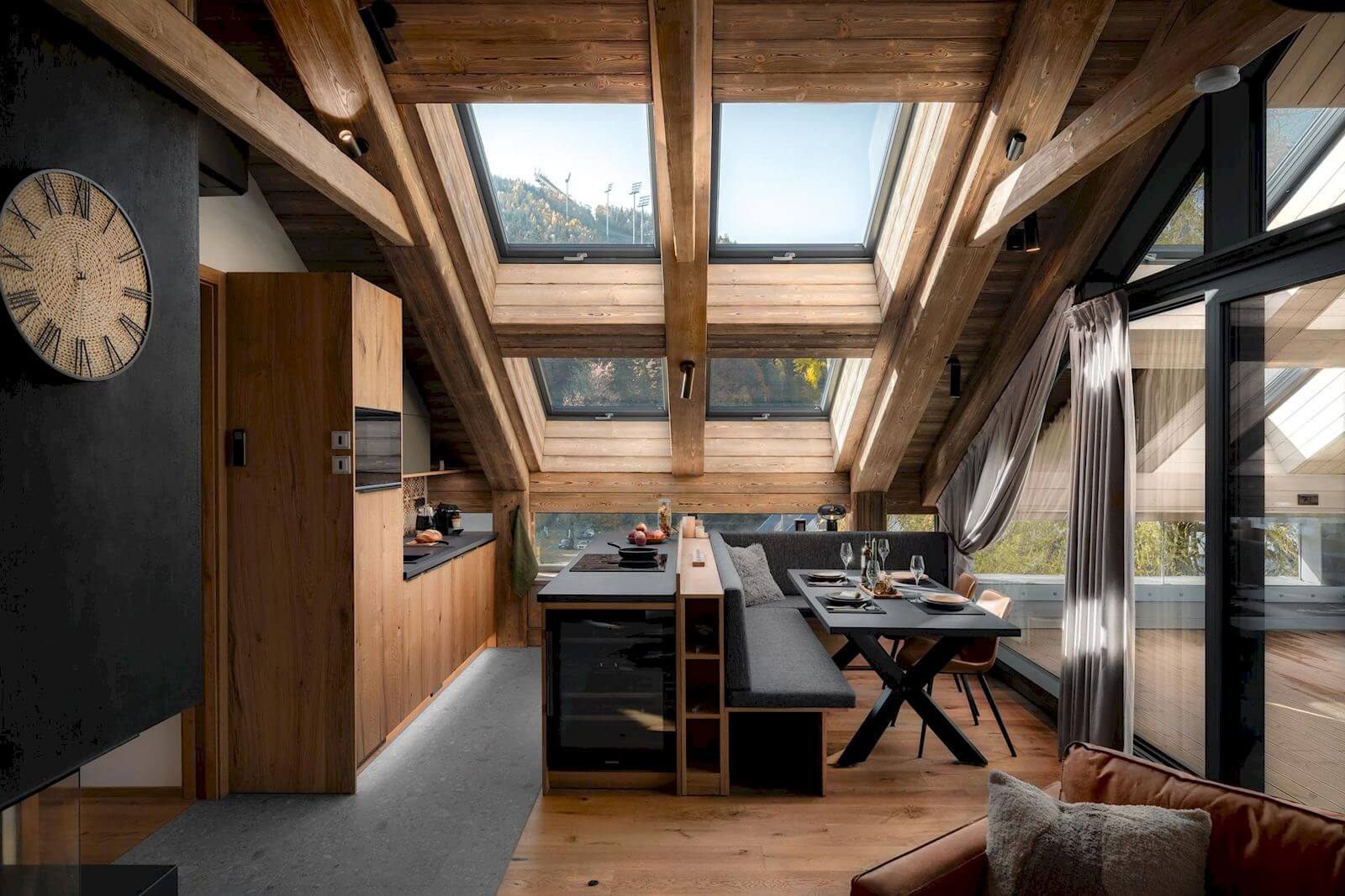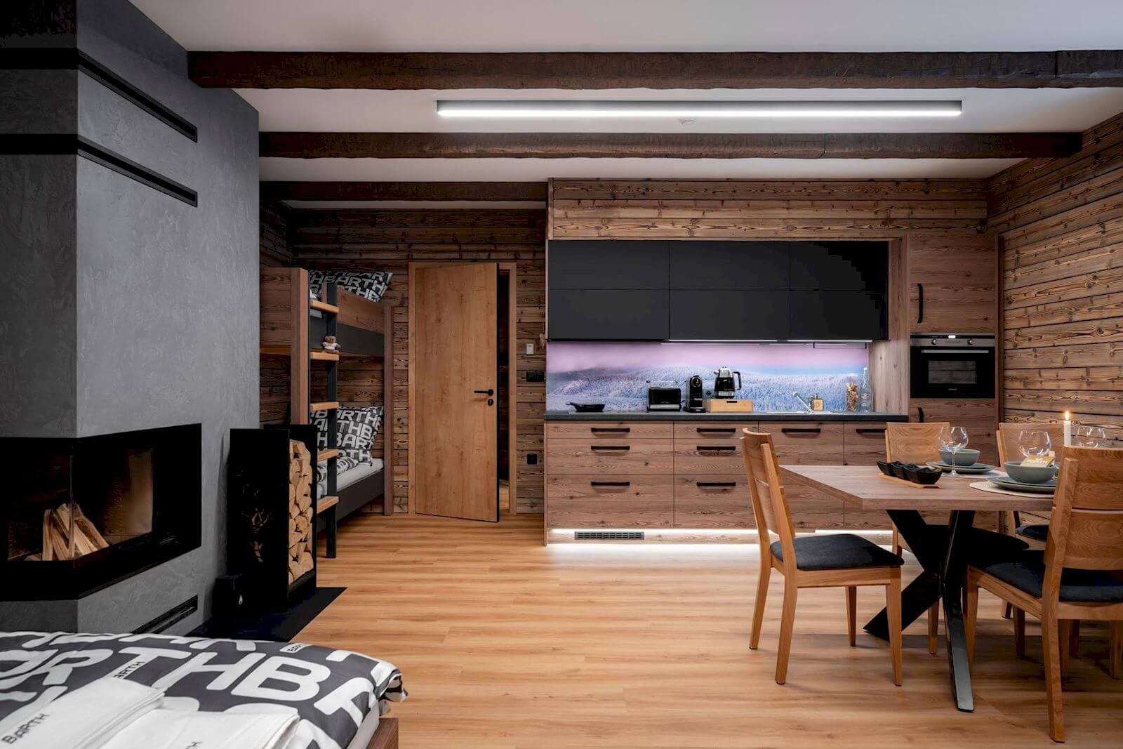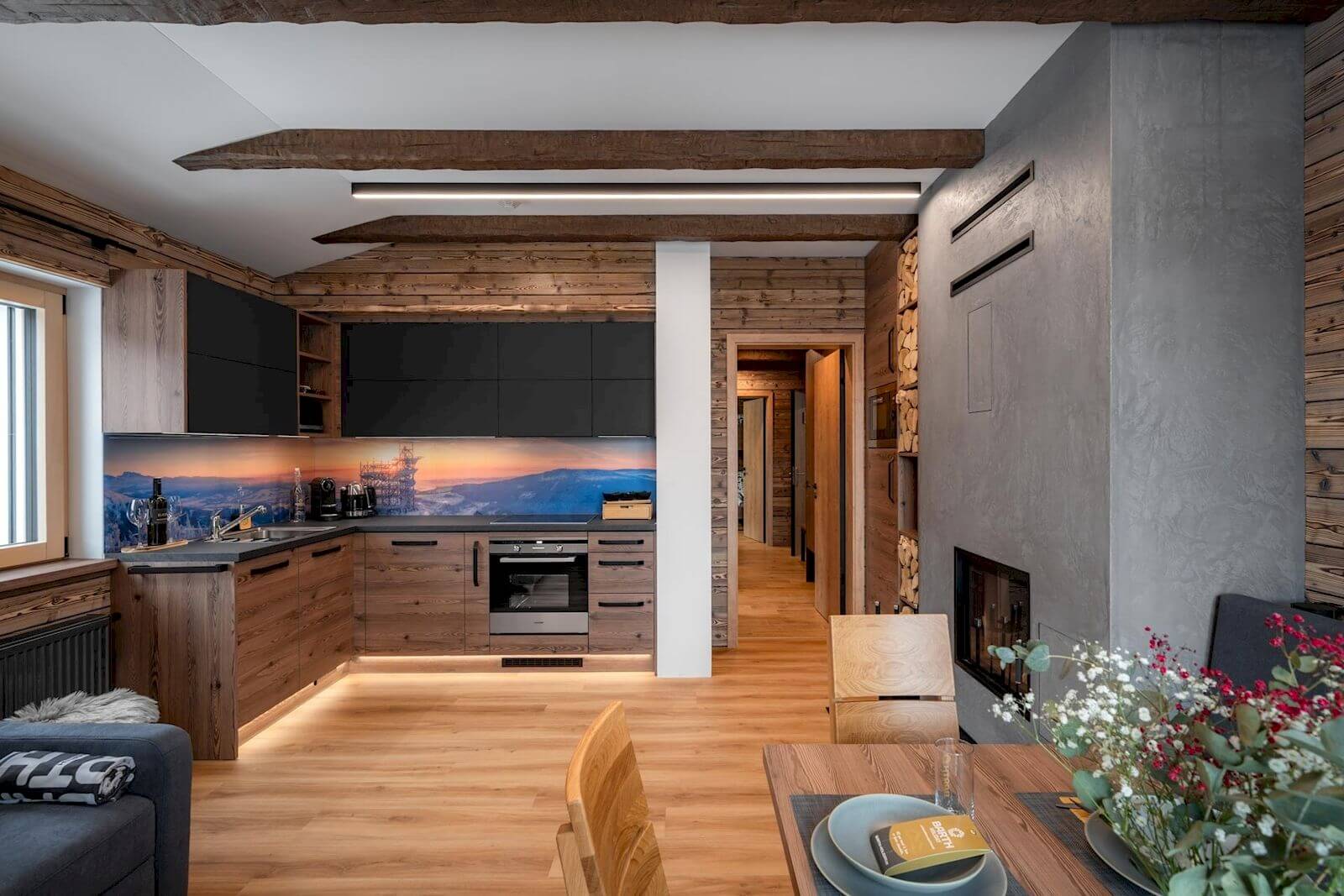 V Harrachově jsme kompletně vybavili tři luxusní střešní apartmány včetně kuchyní a vestavěného nábytku. Interiéry jsme navrhli tak, aby spojovaly moderní design s horským charakterem a poskytly hostům maximální komfort.