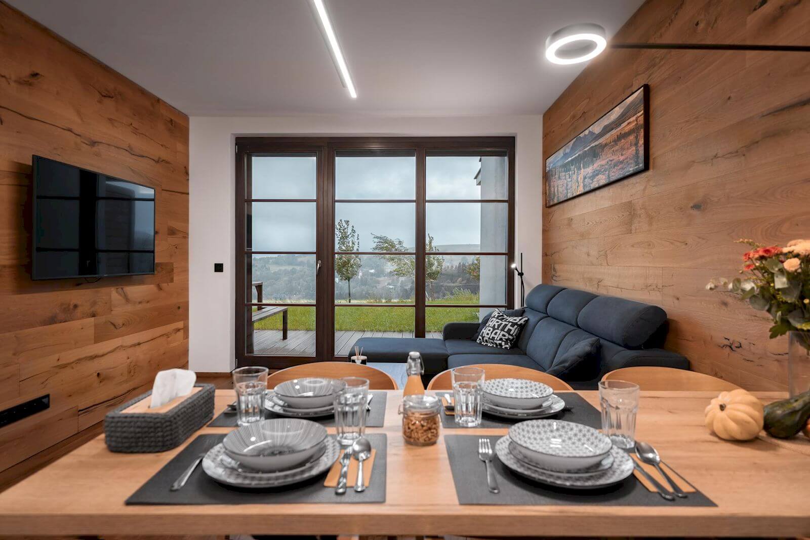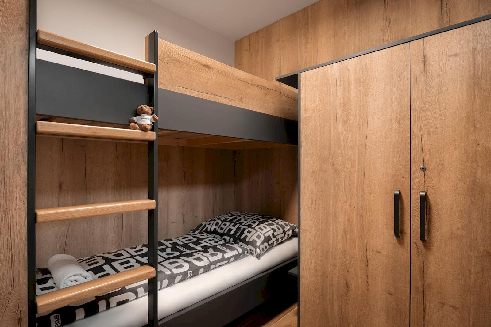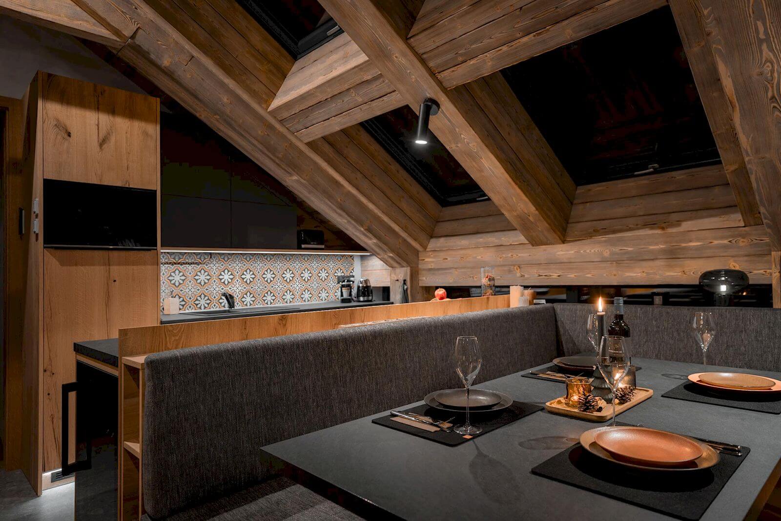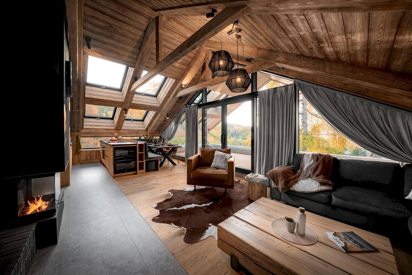 V Harrachově jsme kompletně vybavili tři luxusní střešní apartmány včetně kuchyní a vestavěného nábytku. Interiéry jsme navrhli tak, aby spojovaly moderní design s horským charakterem a poskytly hostům maximální komfort.