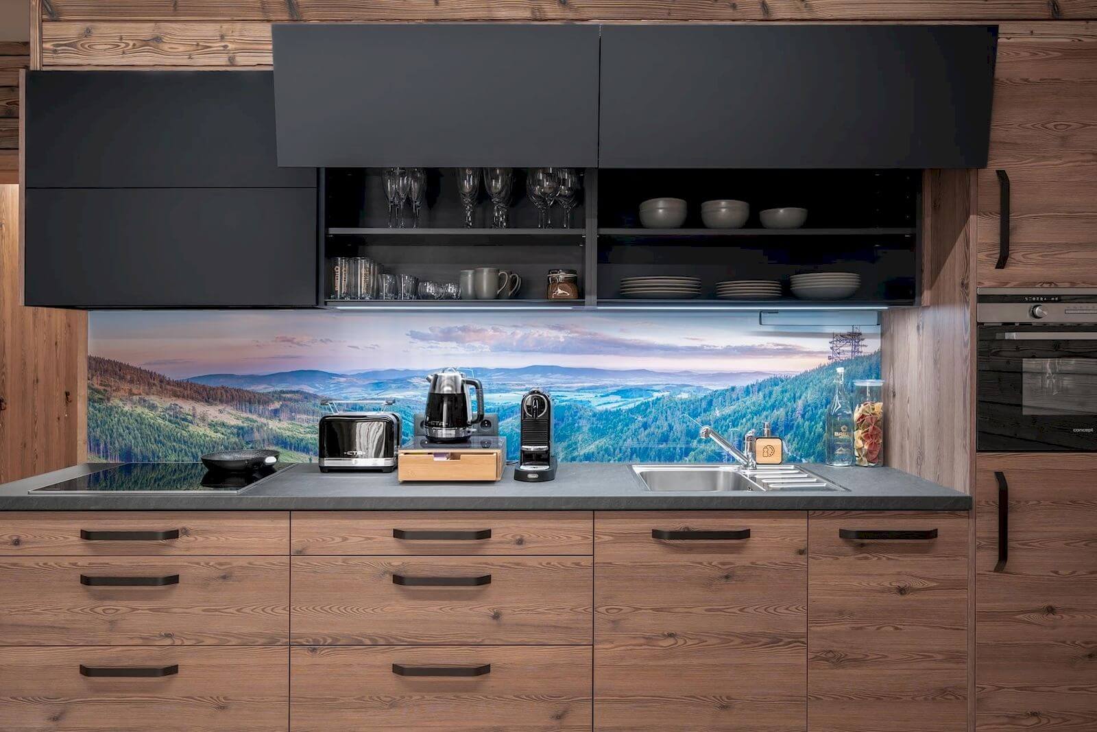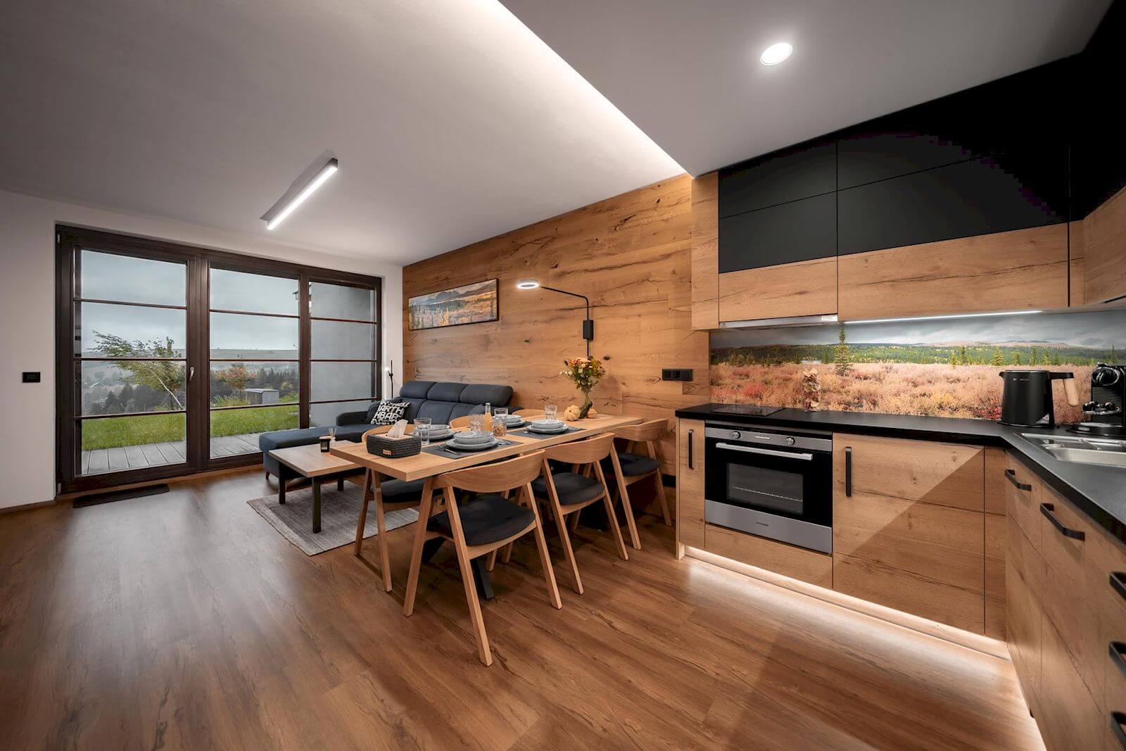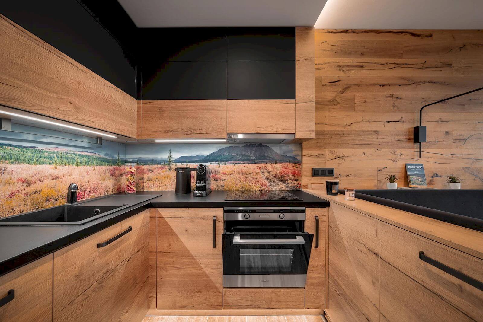 V kuchyních jsme použili grafosklo s originálními fotografiemi Říček, které interiéru dodává osobitý charakter. Každý apartmán je prakticky řešený pro pohodlný pobyt – od plně vybavené kuchyně, přes vestavěné skříně, až po prostorný obývací kout s jídelním sezením.