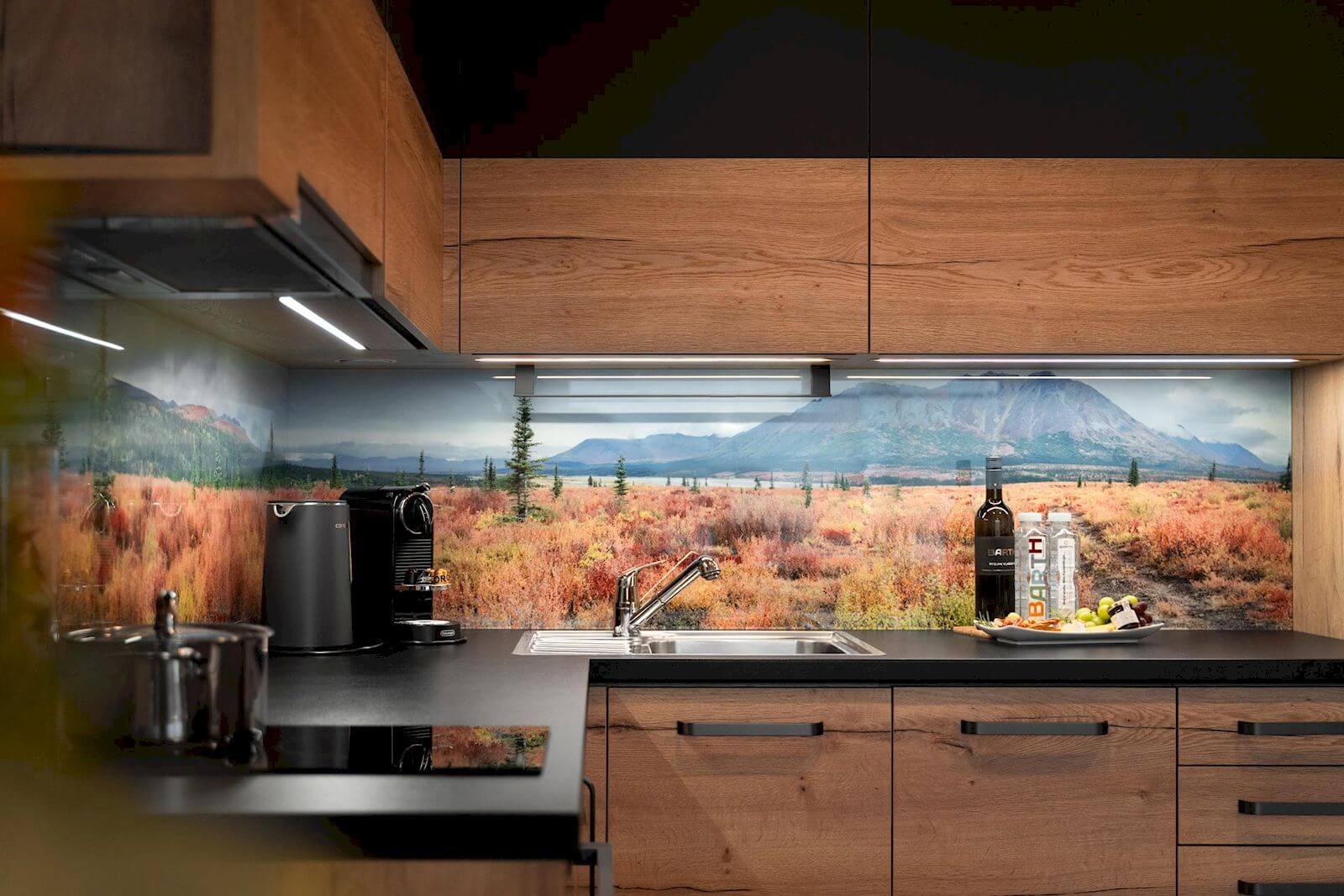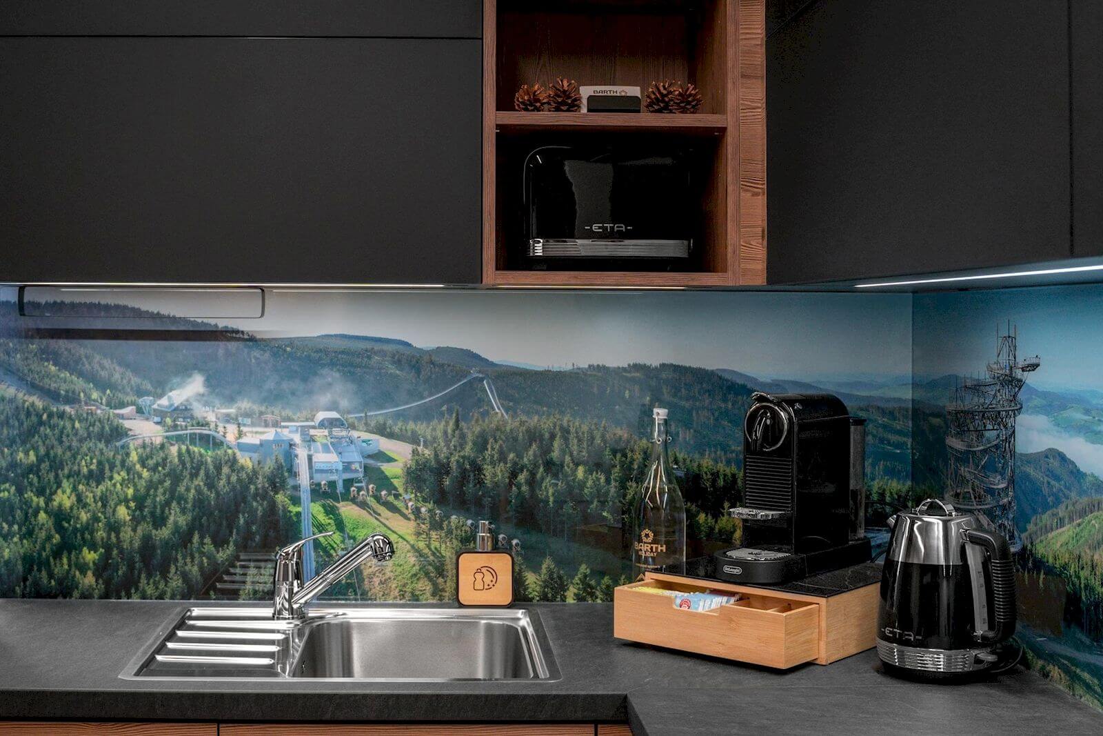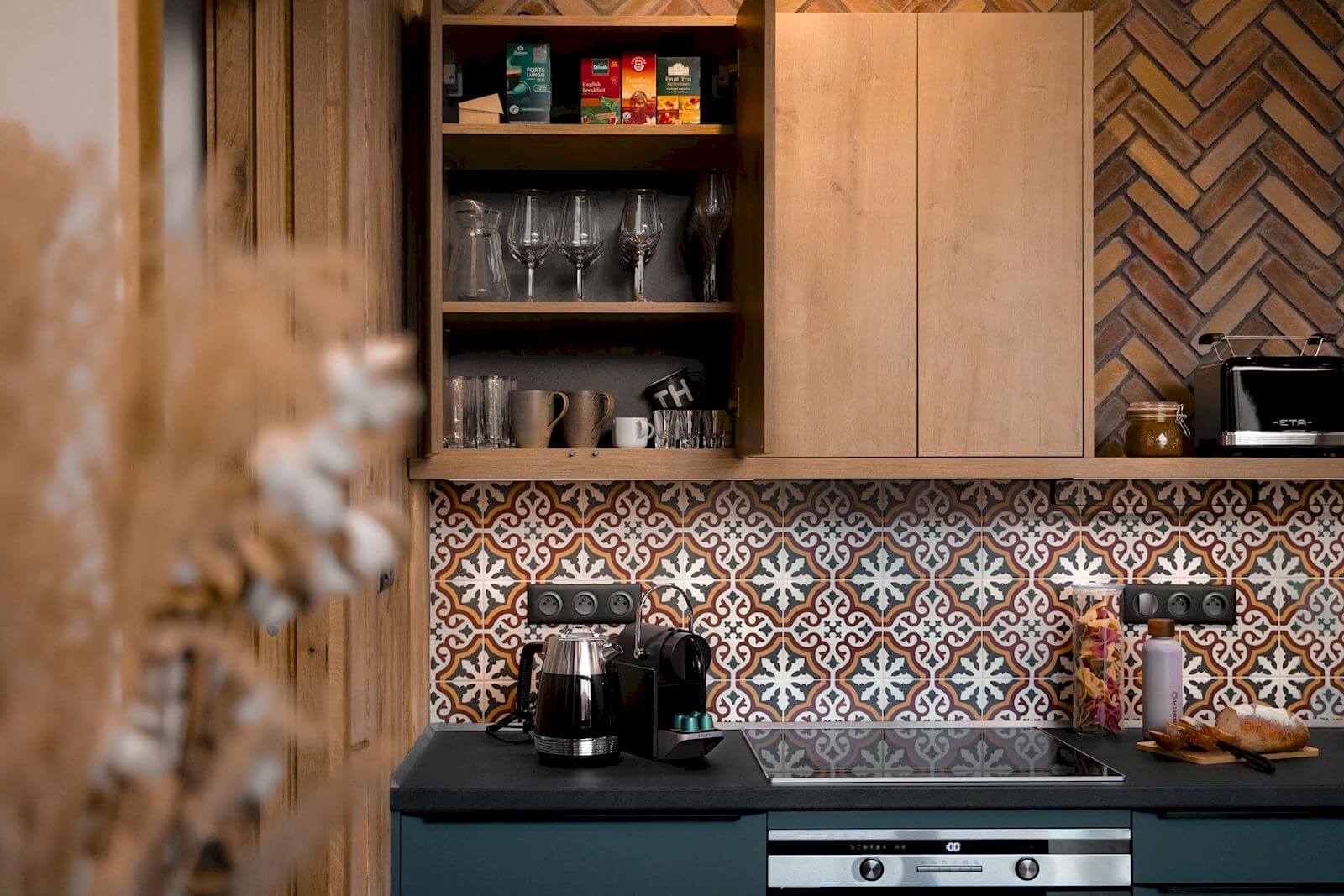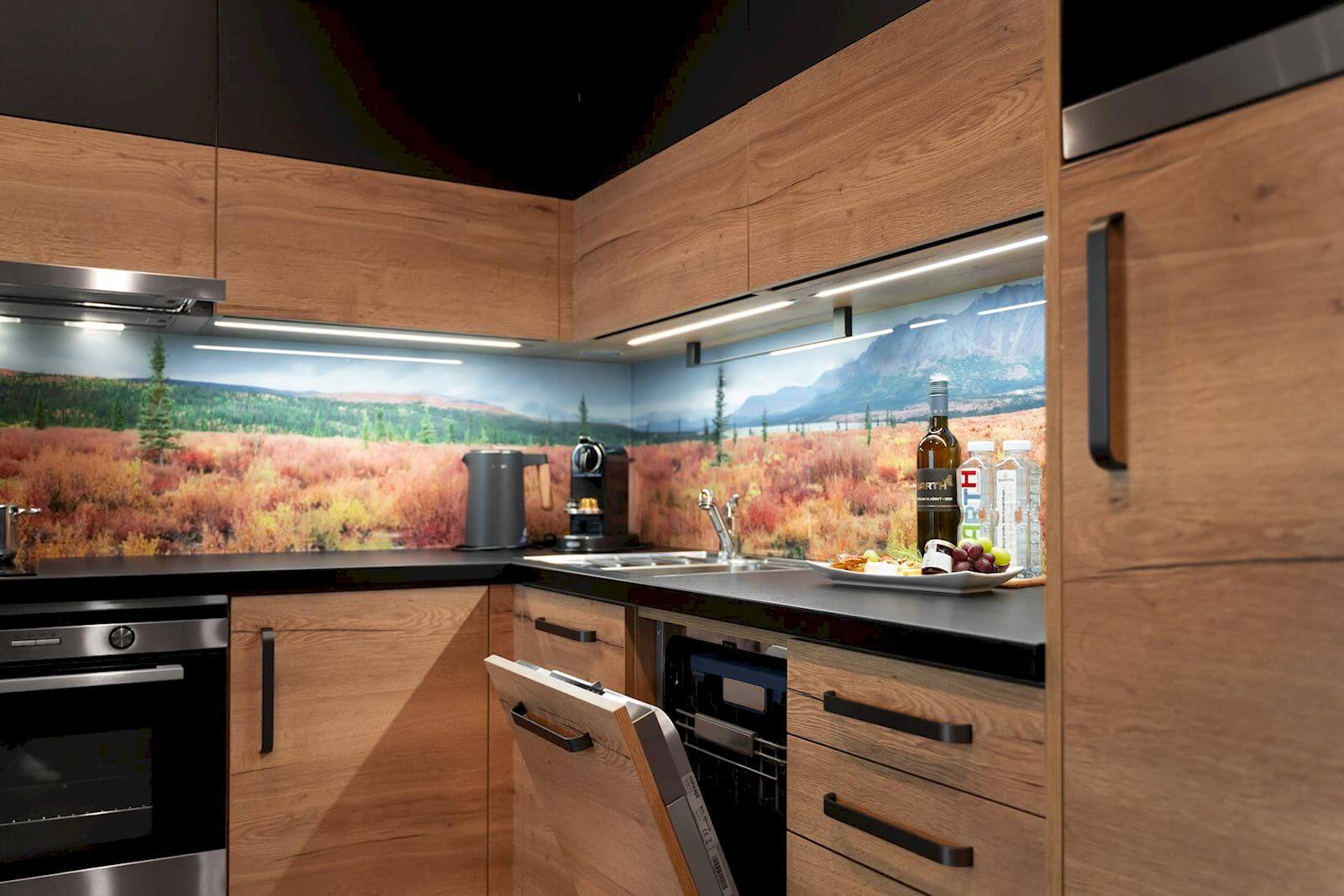 V kuchyních jsme použili grafosklo s originálními fotografiemi Říček, které interiéru dodává osobitý charakter. Každý apartmán je prakticky řešený pro pohodlný pobyt – od plně vybavené kuchyně, přes vestavěné skříně, až po prostorný obývací kout s jídelním sezením.