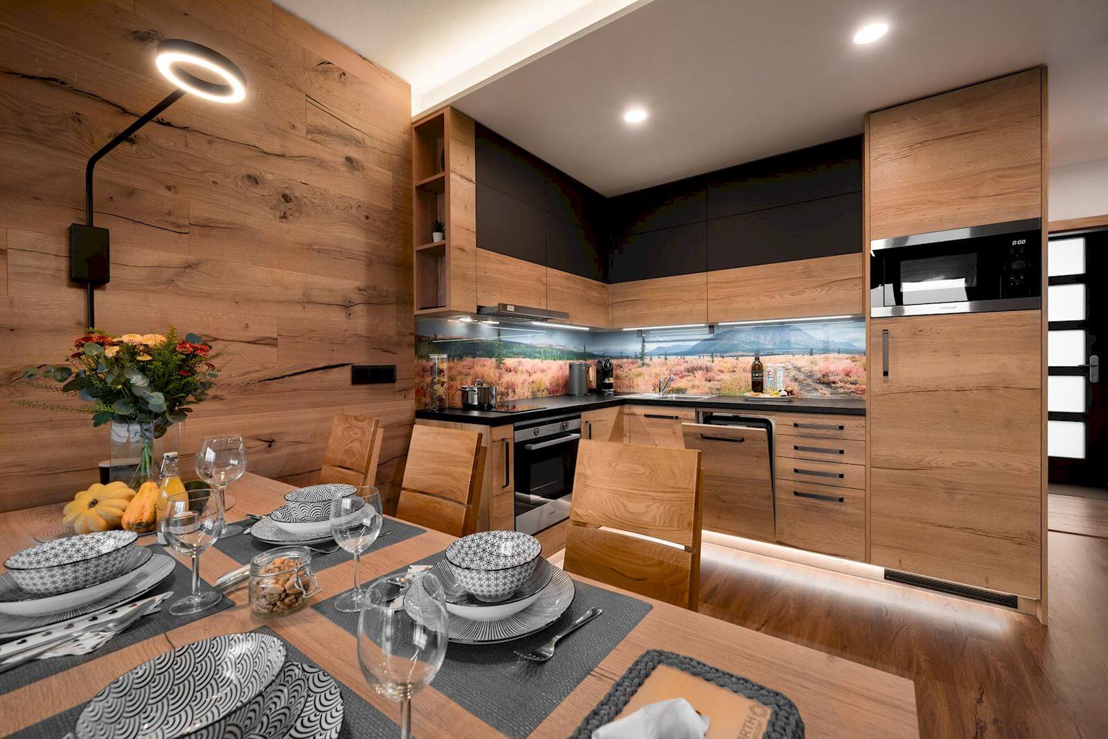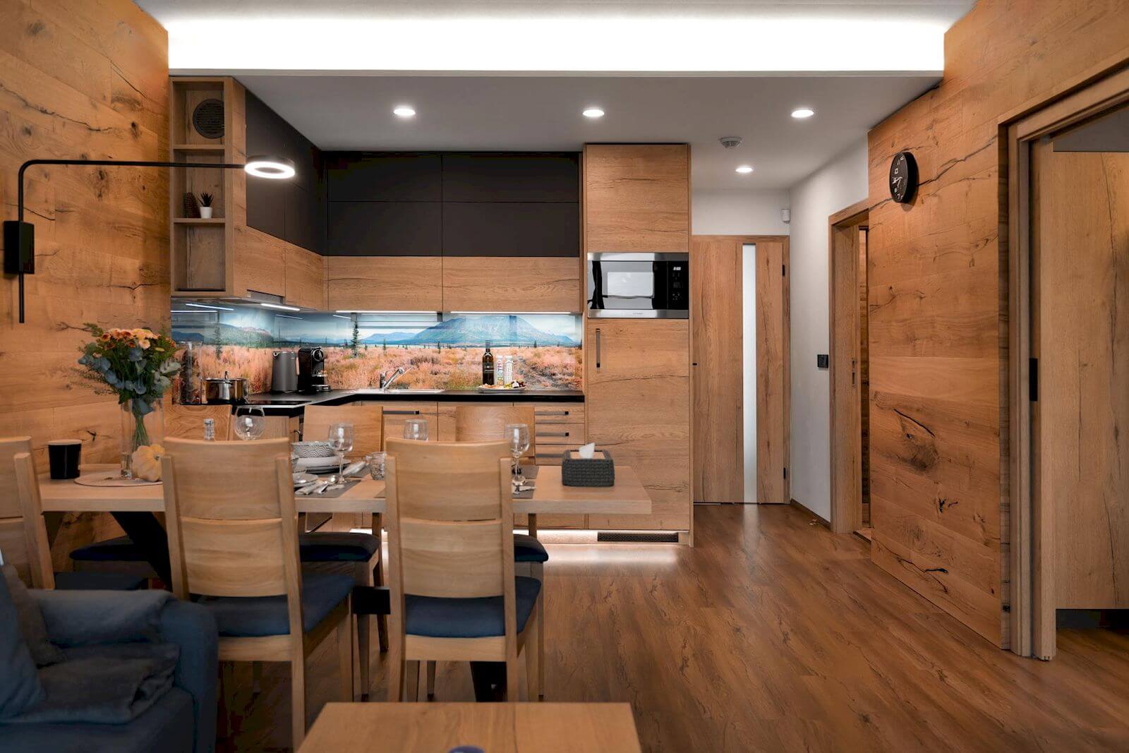 Interiéry a kuchyně na míru pro 10 apartmánů a wellness zónu