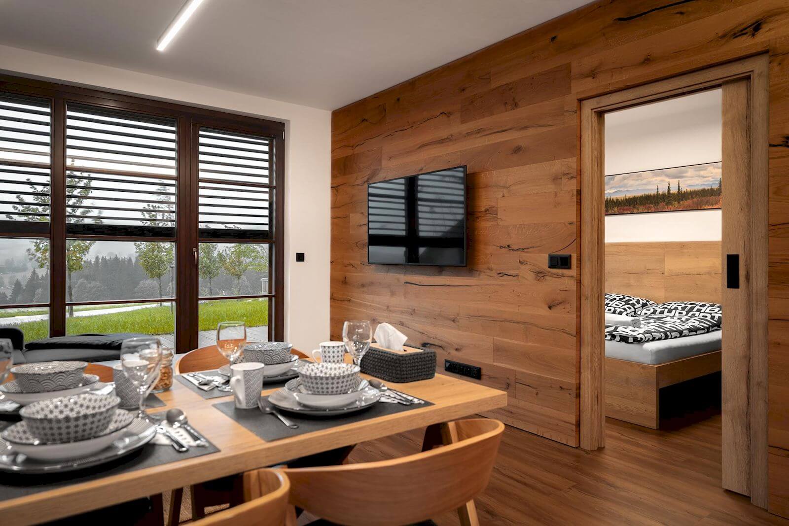 Kompletně jsme vybavili deset apartmánů v Dolní Moravě - od kuchyní po vestavěný nábytek, s výjimkou koupelen. Stejně jako u projektu v Říčkách jsme původní cihlové stavby proměnili pomocí dřevěných palubek a masivních obkladů na míru, které vytvořily útulnou horskou atmosféru.
